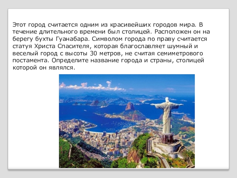 времени был столицей. Расположен он на берегу бухты Гуанабара. Символом города по праву считается статуя Христа Спасителя, которая благославляет шумный и веселый город с высоты 30 метров, не считая семиметрового постамента. Определите название города и страны, столицей которой он являлся.