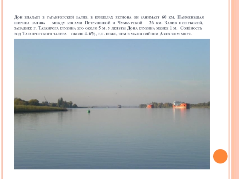 км. Наименьшая ширина залива – между косами Петрушиной и Чумбурской – 26 км. Залив неглубокий, западнее г. Таганрога глубина его около 5 м. у дельты Дона глубина менее 1 м. Солёность вод Таганрогского залива – около 4-6%, т.е. ниже, чем в малосолёном Азовском море.