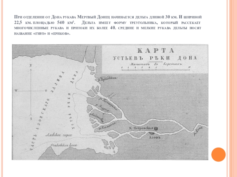 Слайд 5При отделении от Дона рукава Мертвый Донец начинается дельта длиной 30