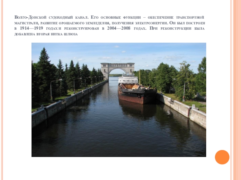 Слайд 18Волго-Донской судоходный канал. Его основные функции – обеспечение транспортной магистрали, развитие