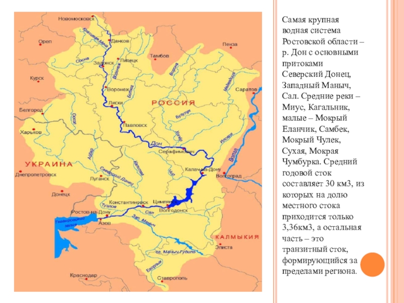 притоками Северский Донец, Западный Маныч, Сал. Средние реки – Миус, Кагальник, малые – Мокрый Еланчик, Самбек, Мокрый Чулек, Сухая, Мокрая Чумбурка. Средний годовой сток составляет 30 км3, из которых на долю местного стока приходится только 3,36км3, а остальная часть – это транзитный сток, формирующийся за пределами региона.