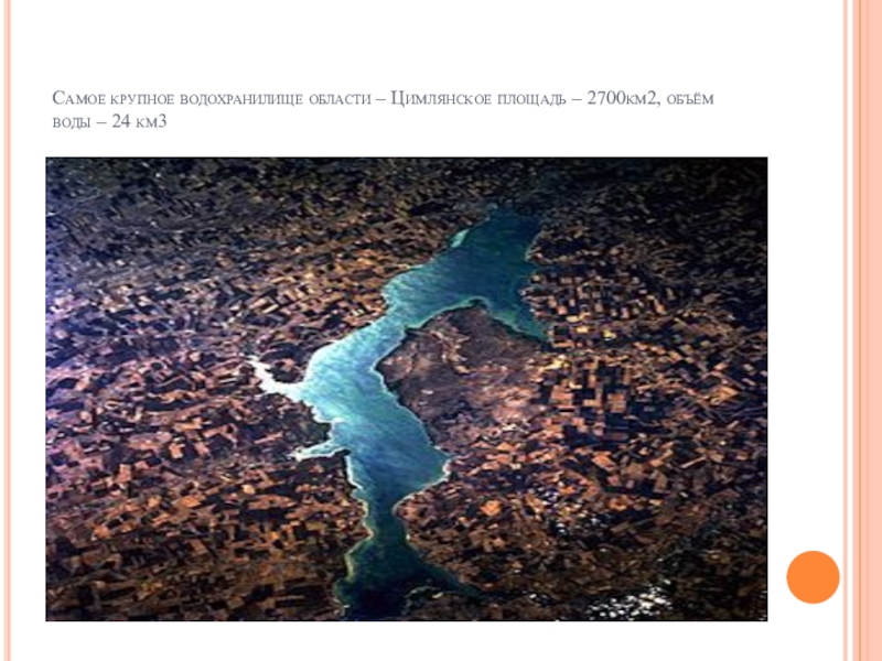 Слайд 12Самое крупное водохранилище области – Цимлянское площадь – 2700км2, объём воды