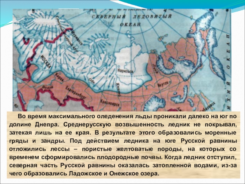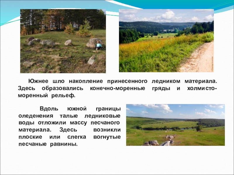 Вдоль южной границы оледенения талые ледниковые воды отложили массу песчаного материала. Здесь возникли плоские или слегка вогнутые песчаные равнины.