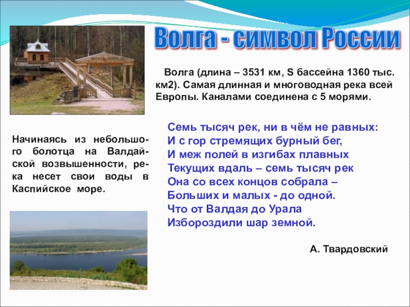 Начинаясь из небольшо-го болотца на Валдай-ской возвышенности, ре-ка несет свои воды в Каспийское море.