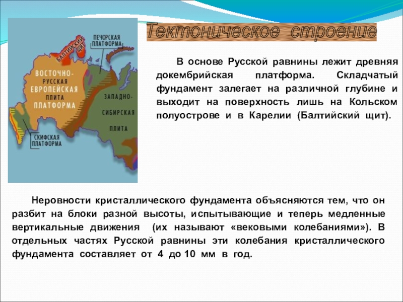В основе Русской равнины лежит древняя докембрийская платформа. Складчатый фундамент залегает на различной глубине и выходит на поверхность лишь на Кольском полуострове и в Карелии (Балтийский щит).