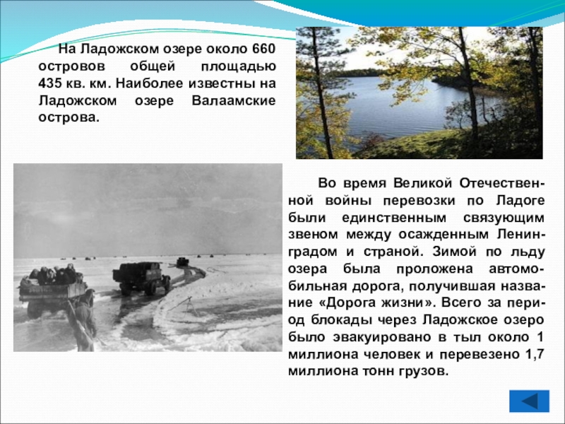 На Ладожском озере около 660 островов общей площадью 435 кв. км. Наиболее известны на Ладожском озере Валаамские острова.