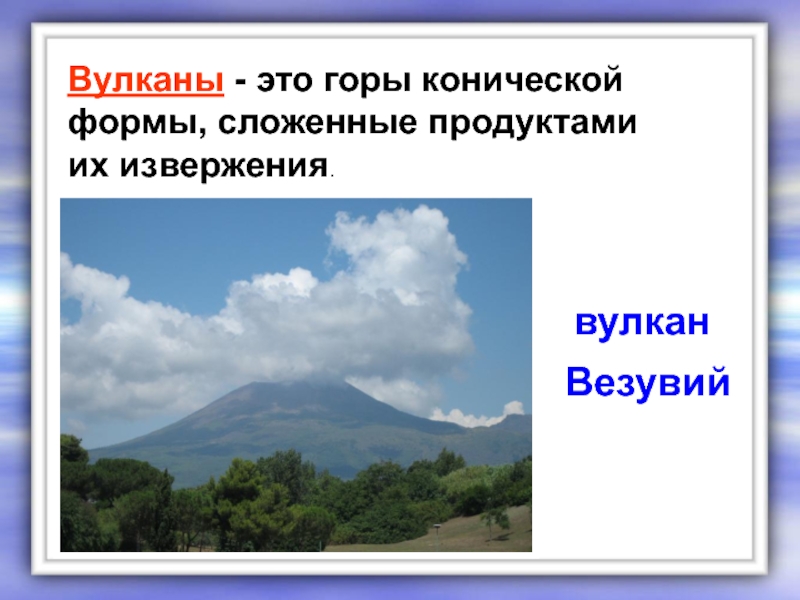 Вулканы - это горы конической формы, сложенные продуктами их извержения. вулкан Везувий