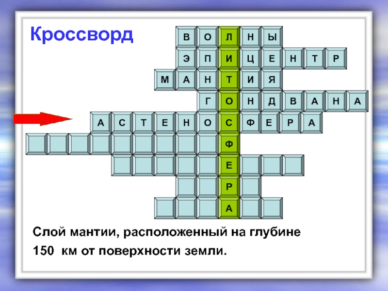 ОНЫВФРИАНСЛИТОЕРАТНЕЦЭПМЯАРЕФСТЕНОАНАВДНГАКроссвордСлой мантии, расположенный на глубине 150 км от поверхности земли.