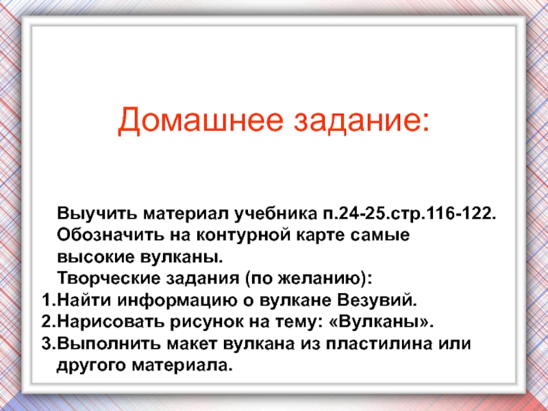 Домашнее задание:Выучить материал учебника п.24-25.стр.116-122.Обозначить на контурной карте самые высокие вулканы.Творческие задания (по желанию):Найти информацию о вулкане