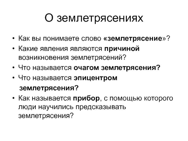 О землетрясенияхКак вы понимаете слово «землетрясение»?Какие явления являются причиной возникновения землетрясений?Что называется очагом землетрясения?Что называется эпицентром