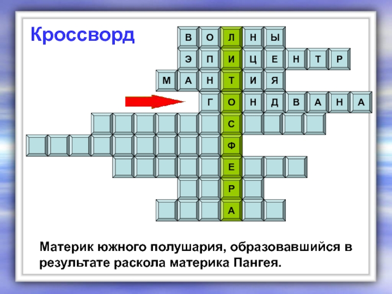ОНЫВФРИАНСЛИТОЕРАТНЕЦЭПМЯНАВДНГАКроссвордМатерик южного полушария, образовавшийся врезультате раскола материка Пангея.
