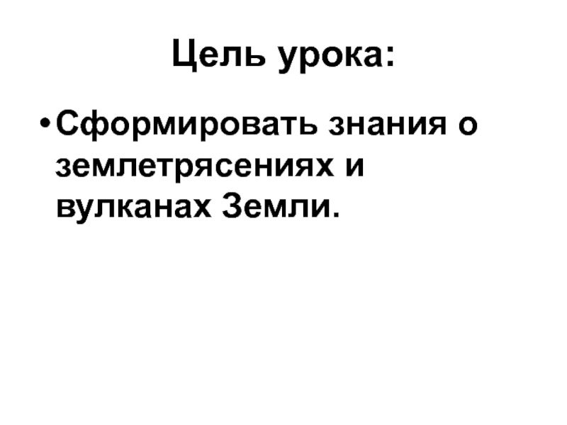 Цель урока:Сформировать знания о землетрясениях и вулканах Земли.