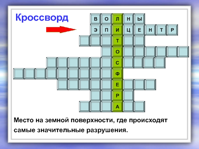 ОНЫВФРСЛИТОЕРАТНЕЦЭПКроссвордМесто на земной поверхности, где происходят самые значительные разрушения.