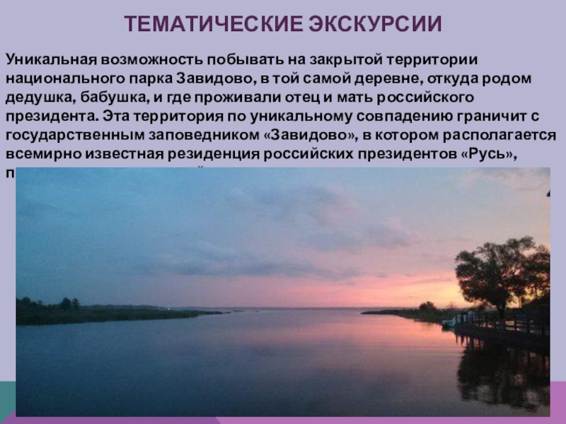 в той самой деревне, откуда родом дедушка, бабушка, и где проживали отец и мать российского президента. Эта территория по уникальному совпадению граничит с государственным заповедником «Завидово», в котором располагается всемирно известная резиденция российских президентов «Русь», поэтому вход для «людей с улицы» сюда весьма затруднителен