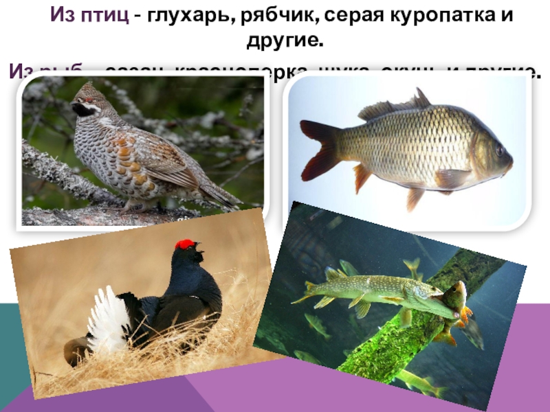 Слайд 14 Из птиц - глухарь, рябчик, серая куропатка и другие.