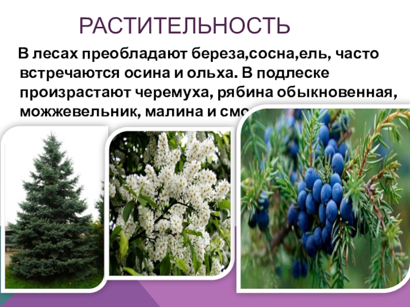 и ольха. В подлеске произрастают черемуха, рябина обыкновенная, можжевельник, малина и смородина.