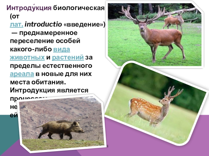 Слайд 15 Интроду́кция биологическая (от лат. introductio «введение») — преднамеренное переселение особей какого-либо вида