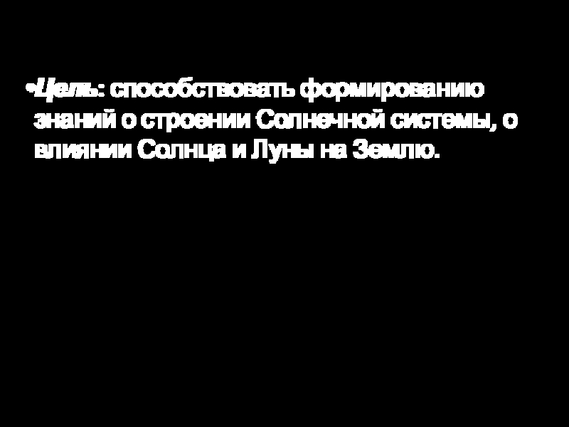 Цель: способствовать формированию знаний о строении Солнечной системы, о влиянии Солнца и Луны на Землю.
