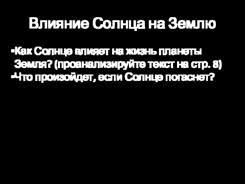 Влияние Солнца на ЗемлюКак Солнце влияет на жизнь планеты Земля? (проанализируйте текст на стр. 8)Что произойдет, если