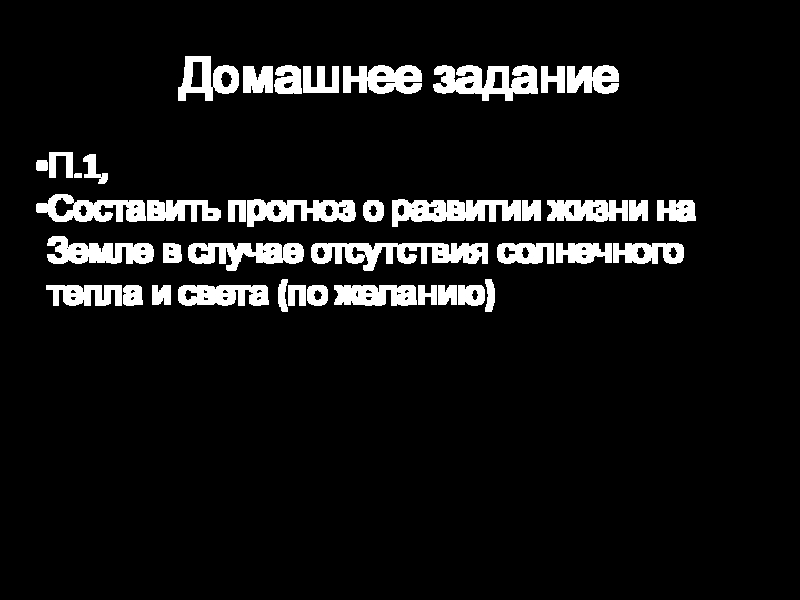 Домашнее заданиеП.1, Составить прогноз о развитии жизни на Земле в случае отсутствия солнечного тепла и света (по