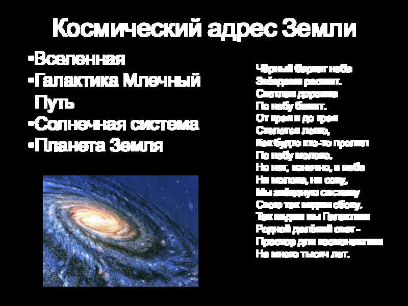 Космический адрес ЗемлиВселеннаяГалактика Млечный ПутьСолнечная системаПланета ЗемляЧёрный бархат небаЗвёздами расшит.Светлая дорожкаПо небу бежит.От края и до краяСтелется