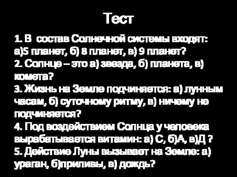 Тест1. В состав Солнечной системы входят:а)5 планет, б) 8 планет, в) 9 планет?2. Солнце – это а)