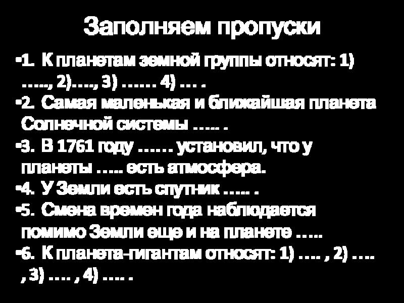 Заполняем пропуски1.	К планетам земной группы относят: 1) ….., 2)…., 3) …… 4) … .2.	Самая маленькая и ближайшая