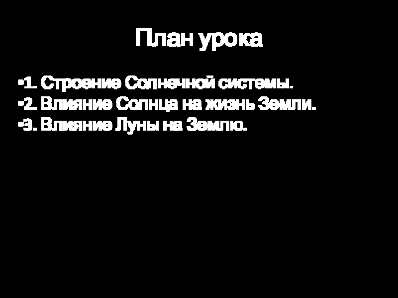 План урока1. Строение Солнечной системы.2. Влияние Солнца на жизнь Земли.3. Влияние Луны на Землю.