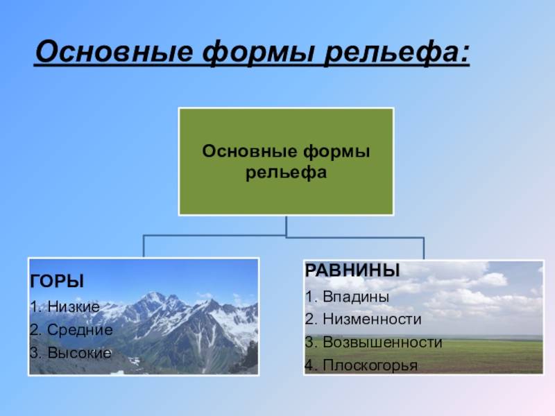 Основные черты рельефа России:В рельефе России преобладают _________________ По особенностям рельефа Россию можно разделить на две части: