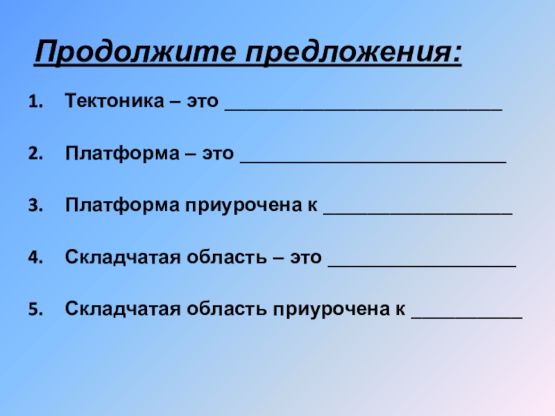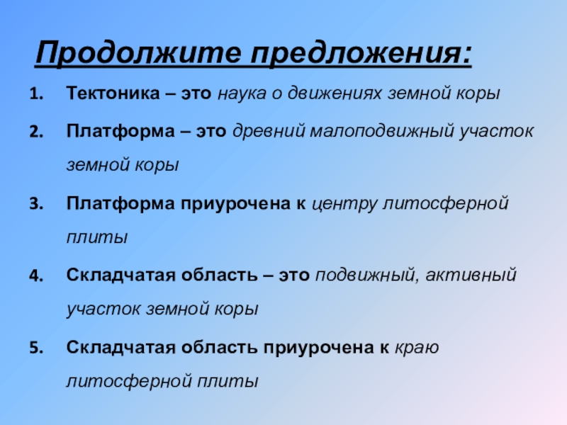 Продолжите предложения:Тектоника – это наука о движениях земной корыПлатформа – это древний малоподвижный участок земной корыПлатформа приурочена