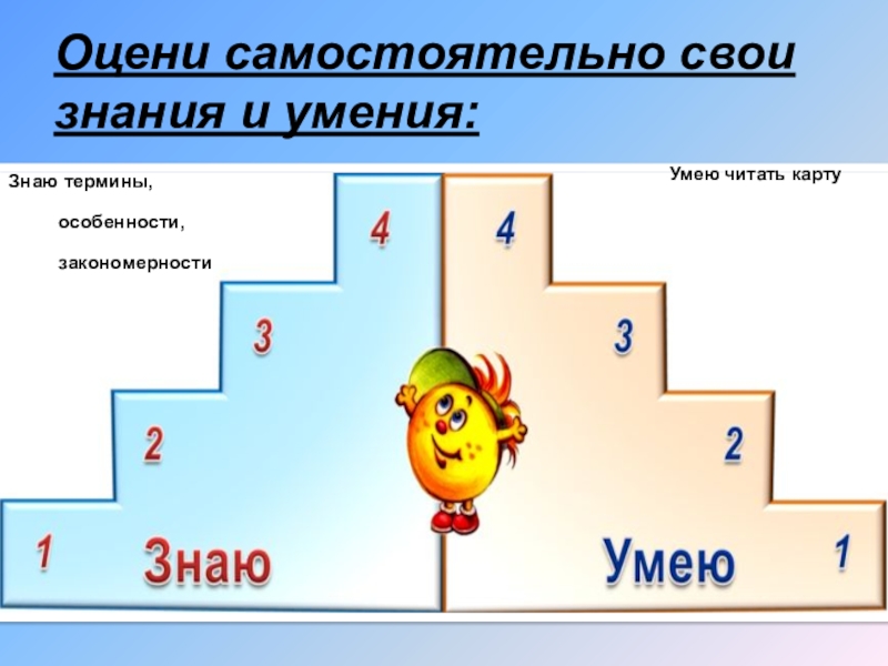 Оцени самостоятельно свои знания и умения:Знаю термины, особенности, закономерностиУмею читать карту