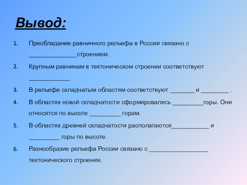 Вывод:Преобладание равнинного рельефа в России связано с ______________строением.Крупным равнинам в тектоническом строении соответствуют ____________В рельефе складчатым областям