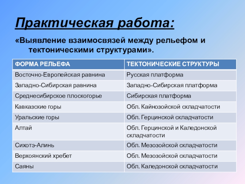 Практическая работа:«Выявление взаимосвязей между рельефом и тектоническими структурами».