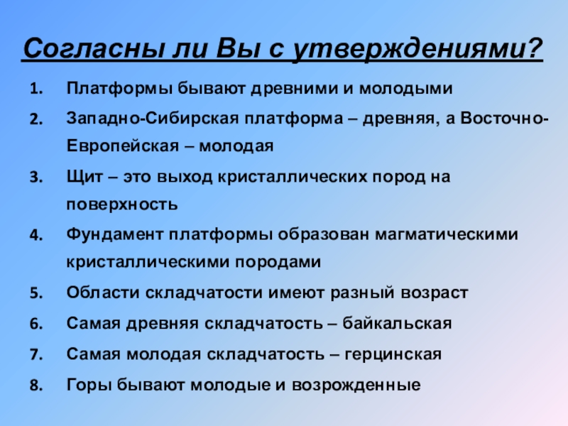 Согласны ли Вы с утверждениями?Платформы бывают древними и молодымиЗападно-Сибирская платформа – древняя, а Восточно-Европейская – молодаяЩит –
