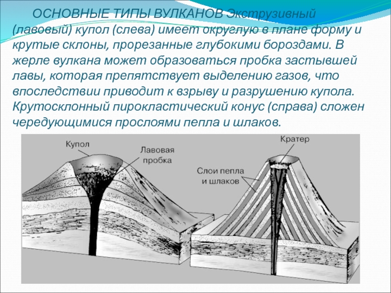 ВУЛКАНОВ Экструзивный (лавовый) купол (слева) имеет округлую в плане форму и крутые склоны, прорезанные глубокими бороздами. В жерле вулкана может образоваться пробка застывшей лавы, которая препятствует выделению газов, что впоследствии приводит к взрыву и разрушению купола. Крутосклонный пирокластический конус (справа) сложен чередующимися прослоями пепла и шлаков.