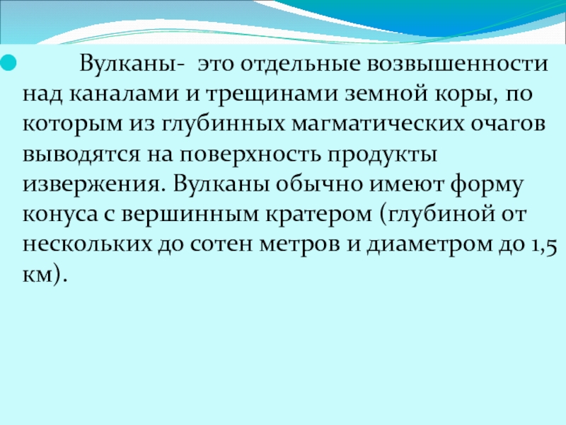 Вулканы- это отдельные возвышенности над каналами и трещинами земной коры, по которым из глубинных магматических очагов выводятся на поверхность продукты извержения. Вулканы обычно имеют форму конуса с вершинным кратером (глубиной от