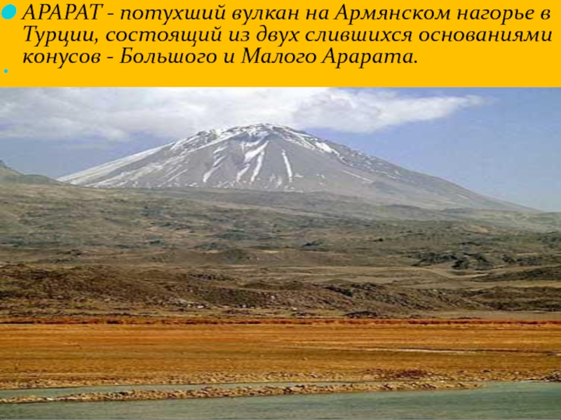 Слайд 6АРАРАТ - потухший вулкан на Армянском нагорье в Турции, состоящий из