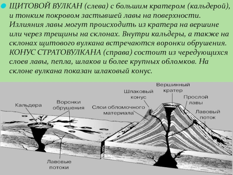 лавы на поверхности. Излияния лавы могут происходить из кратера на вершине или через трещины на склонах. Внутри кальдеры, а также на склонах щитового вулкана встречаются воронки обрушения. КОНУС СТРАТОВУЛКАНА (справа) состоит из чередующихся слоев лавы, пепла, шлаков и более крупных обломков. На склоне вулкана показан шлаковый конус.