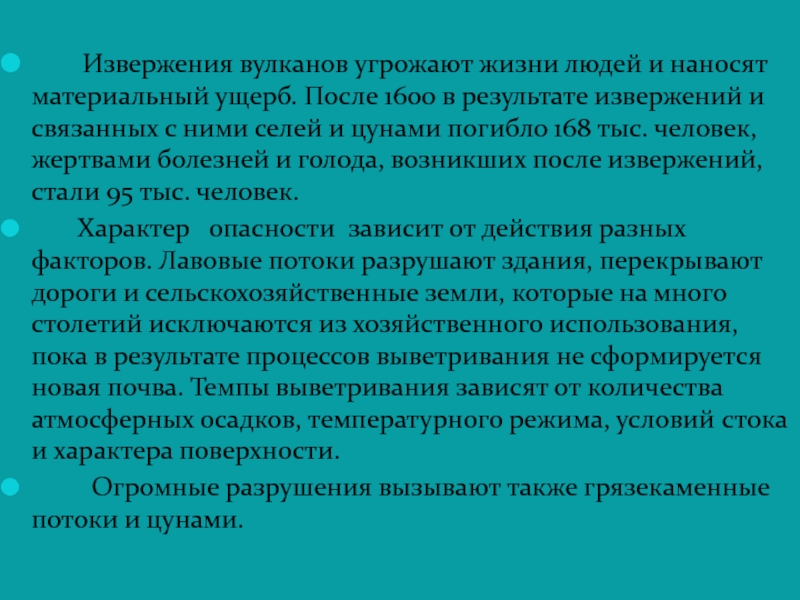 Извержения вулканов угрожают жизни людей и наносят материальный ущерб. После 1600 в результате