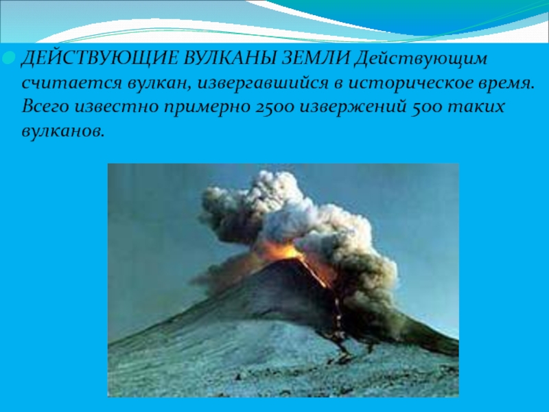 Слайд 3ДЕЙСТВУЮЩИЕ ВУЛКАНЫ ЗЕМЛИ Действующим считается вулкан, извергавшийся в историческое время. Всего