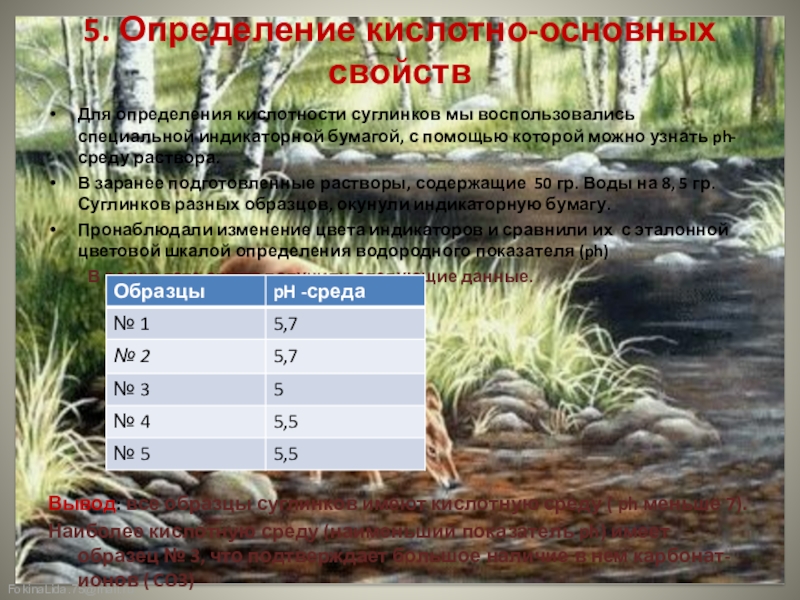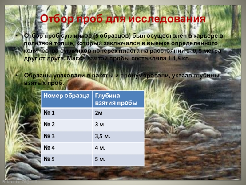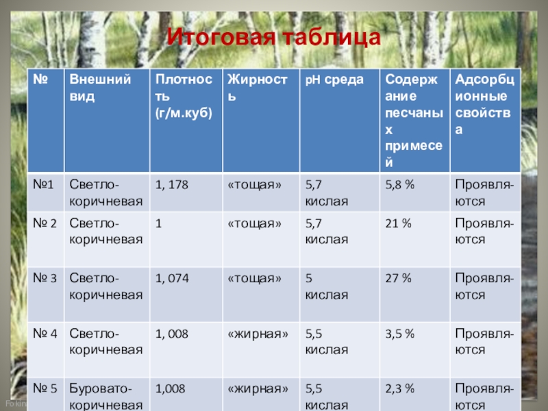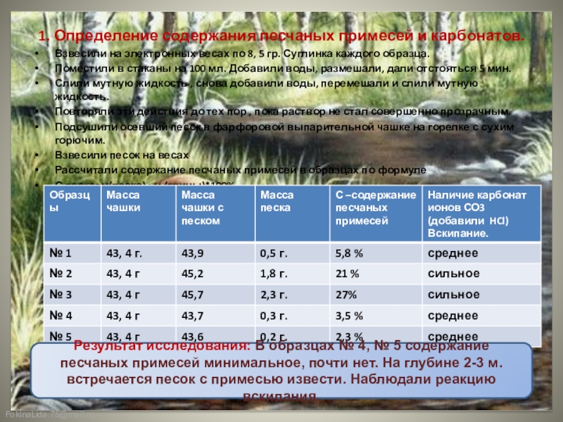 Результат исследования: В образцах № 4, № 5 содержание песчаных примесей минимальное, почти нет. На глубине 2-3 м. встречается песок с примесью извести. Наблюдали реакцию вскипания.
