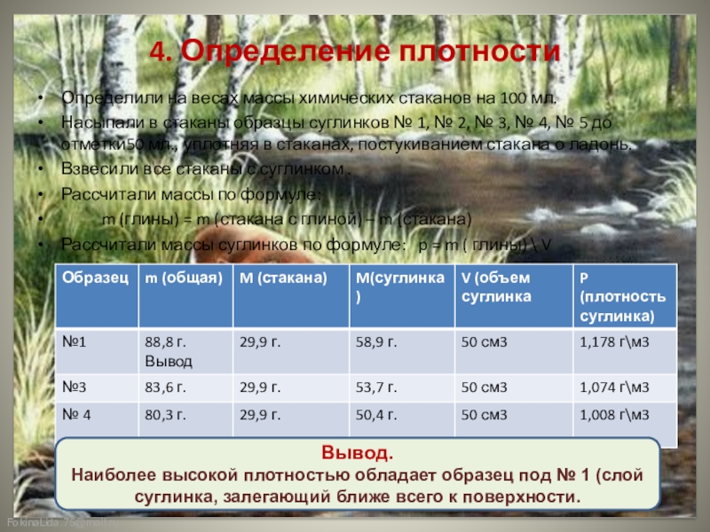 Наиболее высокой плотностью обладает образец под № 1 (слой суглинка, залегающий ближе всего к поверхности.