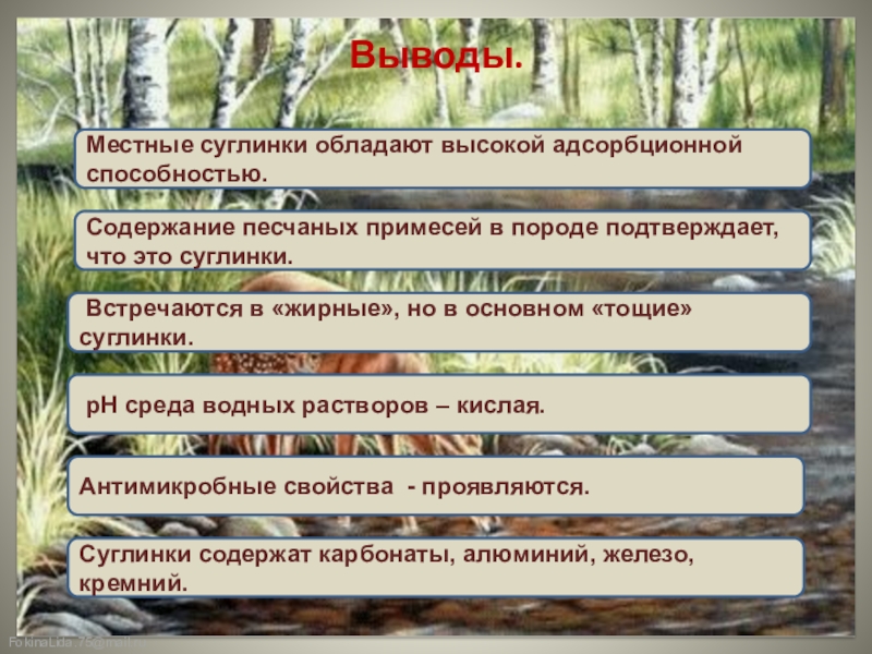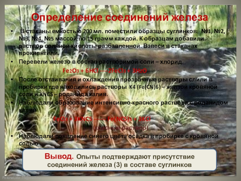 Вывод. Опыты подтверждают присутствие соединений железа (3) в составе суглинков