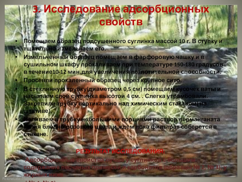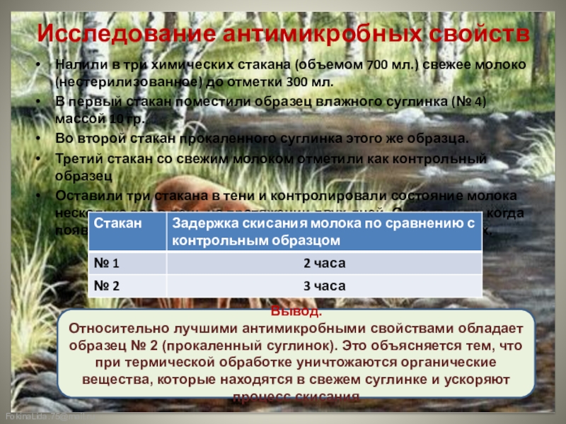 Относительно лучшими антимикробными свойствами обладает образец № 2 (прокаленный суглинок). Это объясняется тем, что при термической обработке уничтожаются органические вещества, которые находятся в свежем суглинке и ускоряют процесс скисания