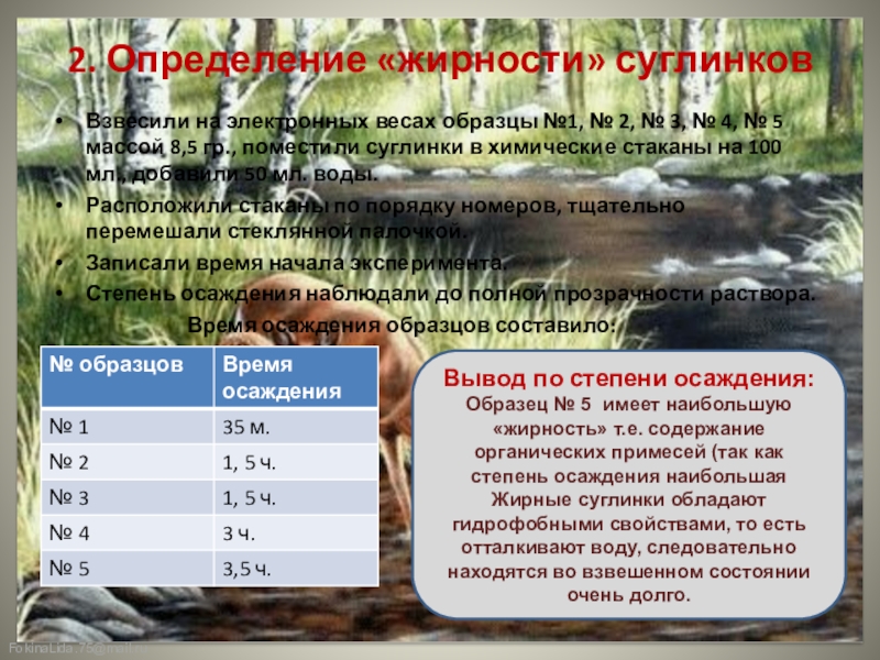Жирные суглинки обладают гидрофобными свойствами, то есть отталкивают воду, следовательно находятся во взвешенном состоянии очень долго.
