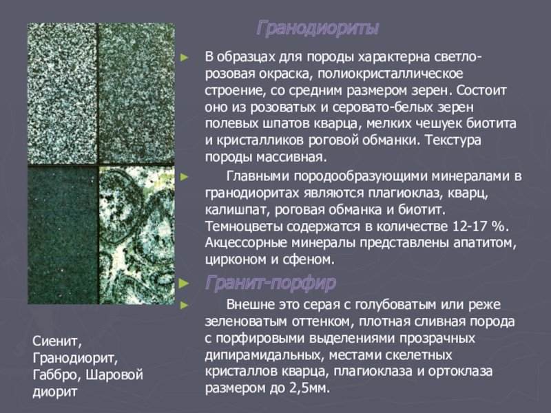 Граниты характеризуются присутствием акцессорных минералов апатита, циркона, сфена.