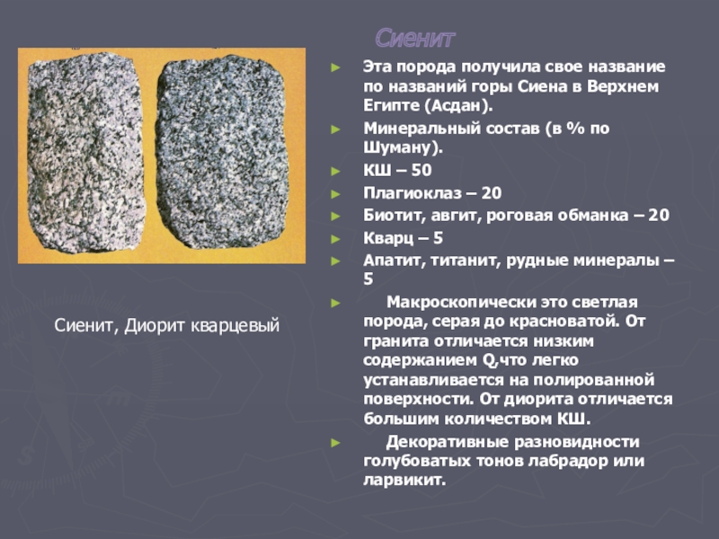 Минералогический состав гранитов довольно простой. Здесь, главным образом, присутствует плагиоклаз, микроклин и кварц. Цветные минералы представлены биотитом, иногда роговой обманкой.