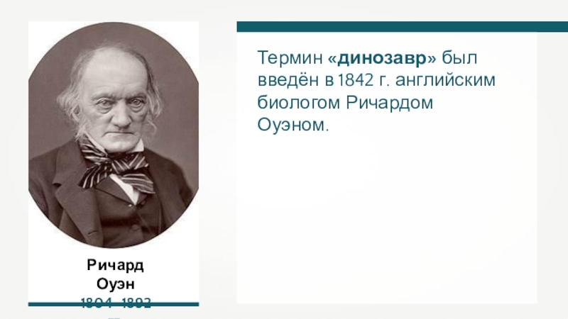Ричард Оуэн1804–1892 гг. Термин «динозавр» был введён в 1842 г. английским биологом Ричардом Оуэном.
