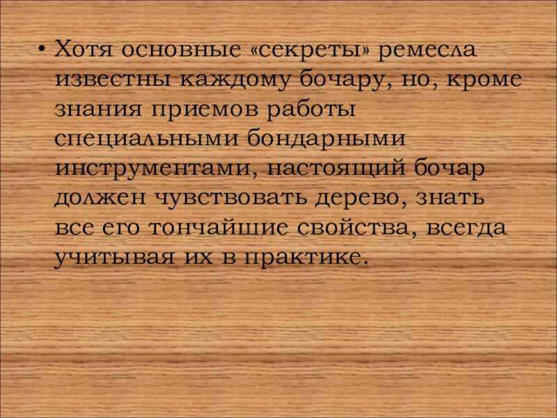 Слайд 7Хотя основные «секреты» ремесла известны каждому бочару, но, кроме знания приемов