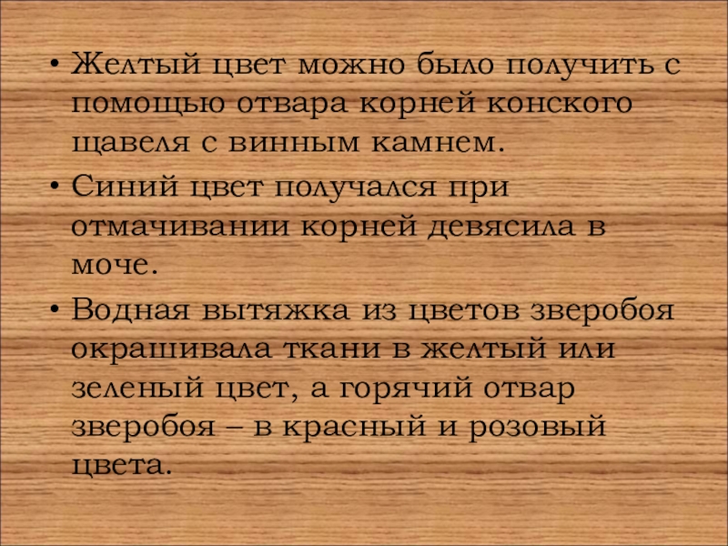 Слайд 32Желтый цвет можно было получить с помощью отвара корней конского щавеля